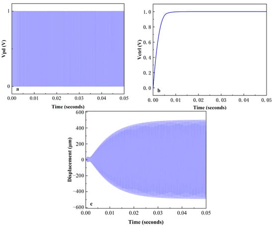 The micro mirror with a Q-factor of 100 achieved self-oscillation under this system with maximum gain. The VCO began to oscillate at an initial frequency of 3500 Hz, and there was a phase difference between the micro mirror motion signal and the driving signal. As shown in Figure 13a, the difference was amplified by PD, and a square wave with a constant frequency was generated. DC voltage was generated by a third-order LPF to regulate the output frequency of VCO. The magnitude is related to the phase difference, as shown in Figure 13b, and almost stabilized at 1 V after about 5 ms. The micro mirror maintained a frequency of 4000 Hz and continued to oscillate, as depicted in Figure 13c, after about 0.043 s. The PLL circuit realized the frequency tracking of the micro mirror, and the gain was similar to that of the open-loop drive simulation before. Self-oscillation was realized in the simulation of the micro mirror system, so it was possible to use an analog PLL circuit to implement a stable driving of micro mirrors.