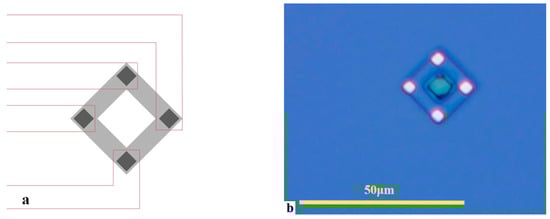 The PR sensor plays a feedback role in this system. As shown in Figure 14a, a silicon PR sensor with a Wheatstone bridge structure was designed, integrated at the end of the micro mirror torsion beam to measure the torsion angle of the micro mirror. A P-type Wheatstone bridge structure PR sensor with longitudinal resistance along the <110> crystal direction was fabricated on an N-type silicon wafer with a <100> crystal plane, and the length direction of the torsion beam of the micro mirror was along the <100> crystal direction. Among them, each piezo resistor forms an angle of 45° or 135° between the longitudinal direction and the long axis of the torsion beam. We designed a single bridge with a length and width of 15 μm and 3 μm, respectively. Electrodes at the four corners of the square structure were led out. Figure 14b is a graphic of the PR sensor section under a metallographic microscope.