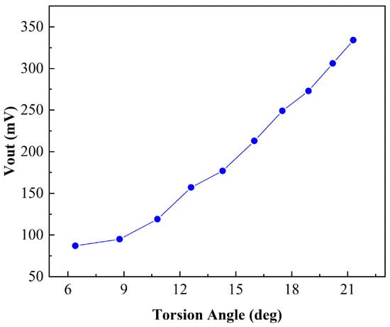 The working characteristic tests of the PR sensor took place, wherein an external force was applied to twist the torsion beam of the integrated PR sensor, with a 5 V power supply voltage applying to both ends of the piezoresistive bridge. The voltage amplitude of the integrated PR sensor is shown in Figure 15. It indicates that the output voltage increases linearly with the torsion angle of the micro mirror approximately. The maximum rate of the output Vpp reached 24.45 mV/deg. Since PR sensors only contain piezoresistive units without capacitors or inductors, the phase difference caused is very small. Thus, the torsion angle detection of the micro mirror is realized through the PR sensor.