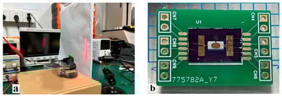 Finally, the effectiveness of the driving circuit was verified through measurement. Figure 16 shows the testing system and the micro mirror. The bias magnetic field was provided by the bottom permanent magnet, generating a Lorentz force to drive the micro mirror. The red laser was conducted on the mirror surface, and the reflected light spot shows the deflection of the micro mirror. The PR sensor is integrated at the end of the micro mirror torsion beam, collecting information on the flipping state of the micro mirror and providing feedback to the driving circuit.