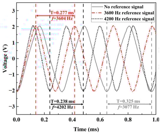 The frequency tracking of the micro mirror system is demonstrated in Figure 17. The frequency of the sinusoidal output voltage varies with the frequency of the reference signal. When there is no reference signal, the output signal is the same as the input and is a 3077 Hz sine wave, as illustrated in Figure 17. Otherwise, the frequency of the output voltage after stabilization follows the reference signal, from 3077 Hz to 3604 Hz or 4202 Hz, with a reference frequency of 3600 Hz and 4200 Hz, respectively. There was a slight deviation between the frequency of the output signal and the reference signal, approximately no more than 10 Hz. This verifies the function of the circuit tracking frequency in this system.
