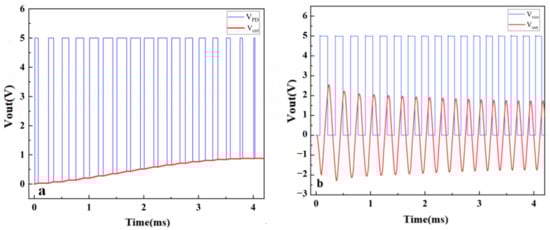 Figure 18a shows the changes in PD output and . The PD adjusts the pulse width based on the phase difference of the input signals, corresponding to the of different amplitudes. Within 1–4 ms, the VCO frequency gradually increased, reducing the phase and frequency difference with the input signal. After about 4 ms, the pulse width stabilized and almost remained at 0.968 V. The results are basically consistent with the simulation results in Figure 13. Figure 18b shows the process of gradually changing the output voltage from 3077 Hz to 4202 Hz. The blue line represents the output of the VCO, while the red line represents the output of the VCO after passing through a waveform converter, which is the driving signal of the micro mirror. The VCO frequency gradually increased within 1–4 ms, reducing the frequency and phase difference with the input signal. The output signal was basically stable after 4 ms, and the amplitude remained at 1.7 V. In addition, after testing, the self-excited oscillation system had a delay of approximately 14.3 ms after frequency locking stability. It is proven that the presented model coincides with the frequency tracking of PLL circuit, which confirms the validity of the proposed driving circuit. It reduces the complexity of the system and the occupied chip area and confirms the possibility of achieving low-power and lightweight design.