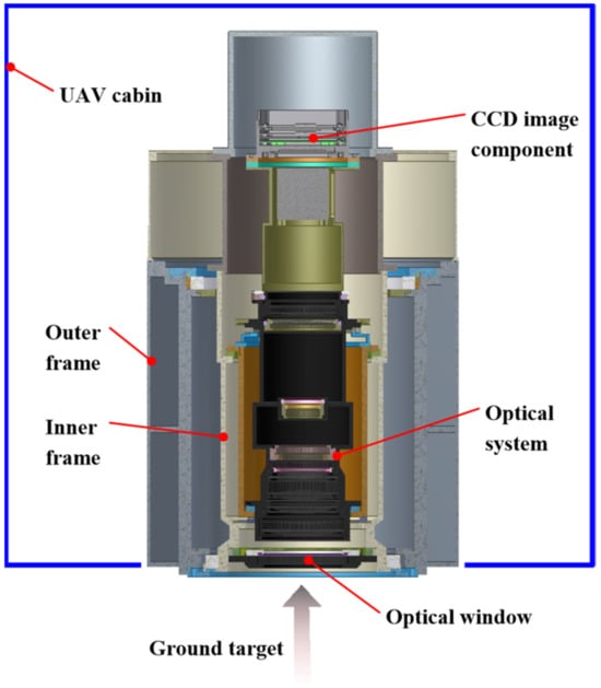 The aerial camera is installed in an unmanned aerial vehicle (UAV), as illustrated in Figure 1. The optical window points vertically towards the ground target, and its outer surface is in contact with the external environment directly. The flight attitude of the UAV is 9000 m, and the ambient temperature is −38.5 °C when the ground temperature is 20 °C. The total power that is allocated to the thermal control system of the camera is 100 W.