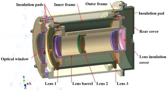 Based on the framework structure of the original prototype of the aerial camera and combining this with the preliminary design for thermal control, an experimental aerial camera is proposed, as shown in Figure 2. The experimental aerial camera (hereinafter referred to as the aerial camera) features rotational symmetry along the X-axis, with an outer dimension of Φ173 mm × 258 mm, including an optical window, three sets of lenses, a lens barrel, inner frame, outer frame, and rear cover. The lens insulation cover is set to simulate the thermal flow impact of the CCD image component on the lens assembly.