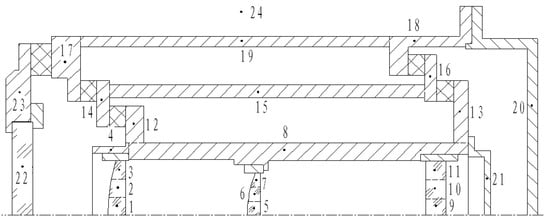 To simplify the model, structures such as screws, holes, and threads that have little effect on the temperature are ignored. Components with high thermal conductivity are sparsely divided into nodes, such as the lens barrel, inner frame, and outer frame. For the lens with a small thickness, the temperature difference in the radial direction is significantly larger than that in the axial direction, thus the nodes of the lens should be densely divided along the radial direction. As the outer surface of the optical window is uniformly influenced by external heat flows, resulting in small temperature differences in both the radial and axial directions, the optical window can be treated as a single node. Therefore, a thermal network model with 23 nodes is established for the aerial camera, as shown in Figure 3. The 24th node represents the external environment. The locations and physical parameters of the nodes are illustrated in Table 2.