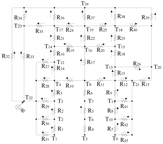 where (mc)i (i = 1~23) is the thermal capacity, T1~T24 are the node temperatures, and R1~R43 are the heat transfer resistances between nodes.