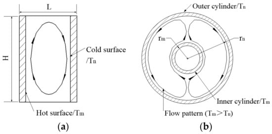 The flow pattern of convective heat transfer: (a) rectangular cavity; (b) concentric cylinder.
