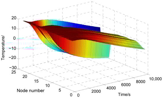 By substituting the heat capacity values in Table 2 and the thermal resistance values of R1 to R43 into Equations (1)–(23), a nonlinear differential equation system for the temperature of 23 nodes is obtained. With the initial temperatures of all nodes set to 20 °C, the temperature variations of each node over a period of 10,000 s, spanning from take-off to the photo-shooting stage, are precisely determined by incorporating the boundary conditions outlined in Equation (33) into the nonlinear differential equation system, as illustrated in Figure 6. In the figure, various colors denote different temperatures. As the hues progressively shift from warm to cool tones, the temperature decreases accordingly. As the figure reveals, despite the lens temperature remaining within the (20 ± 5) °C range during the initial phase of camera operation, it gradually exceeds these temperature specifications as the shooting duration increases. Notably, the optical window temperature decreases more rapidly, falling short of meeting the temperature requirements from the very beginning of camera operation. Therefore, it is crucial to implement active thermal controls for both the lens and the optical window to ensure they remain within the desired temperature range.