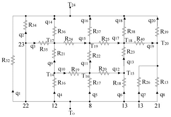 The calculated results of the thermal resistances R1–R43 from the thermal network equations are shown in Table A1.