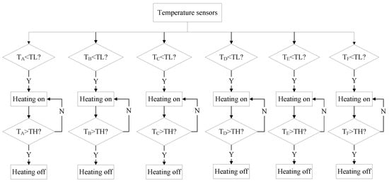 The bang-bang control algorithm was utilized to independently regulate each heating zone, as depicted in Figure 9. According to the temperature sensor inputs, the heating circuits of each zone are activated or deactivated. Specifically, when the temperature of a certain control zone falls below the set lower point (TL), heating is initiated in that zone. Once the temperature reaches the set upper point (TH), heating is stopped. In this way, the optical system temperature is maintained within the desired range of TL to TH.