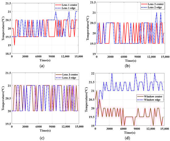 The thermal control system is activated once the temperature inside the high–low temperature chamber begins to vary. Figure 12 presents the temperatures of the optical system changing with time, as measured by the temperature sensors. As can be observed from the figure, during the entire flight duration of the aerial camera, from takeoff to the completion of a shooting task, the temperatures of both lenses and the optical window are maintained within the range of 19 °C to 22 °C, ensuring that the temperature gradients remain below 3 °C. Due to the high-contact thermal resistance between the electrode pairs and the window surface achieved through conductive adhesive, the heat generation at the electrode pairs is relatively high, and the position of the electrode pairs is close to the window edge, resulting in a slightly higher temperature at the window edge than at the center.
