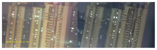 Low image quality often affects subsequent classification [20,21]. To illustrate this issue, we applied the DCNN-ELM algorithm to classify and compare the same scene using the IC Image Sets and WD Image Sets established in this paper. For example, as shown in Figure 2, the PSNR value of the left image is 0.89 dB higher than that of the right image, clearly indicating that the right image’s edge is deformed due to the inherent resolution of the equipment. In the end, the correct classification rate of the left image is 1.2% higher than that of the right image.