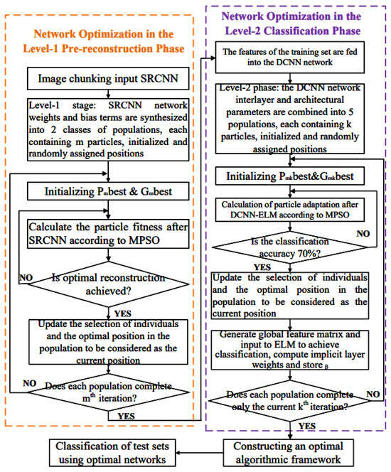 An improved fusion-based particle swarm optimization (MPSO) algorithm is introduced to iteratively optimize the parameters of the Level-1 classification module DCNN-ELM network and the Level-2 reconstruction module SRCNN network. Each stage’s selected particle combination represents one configuration of the optimized integrated network.