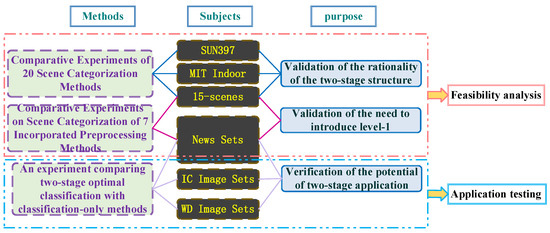 Firstly, we focused on the feasibility of the classification stage model. Consistent with the focus of Section 2.1, we selected three general scene datasets, including indoor and outdoor scenes, based on the complexity of scene structures. We not only demonstrated the architectural stability through parameter selection but also proved its feasibility through comparisons with existing methods. The experimental results reveal that the proposed architecture excels in datasets with fewer classification labels and a higher proportion of outdoor scenes. Additionally, it exhibits higher accuracy in classifying images with higher resolutions. This observation prompts us to consider the contribution of improving the resolution of low-quality images to enhance the overall classification accuracy of the model.