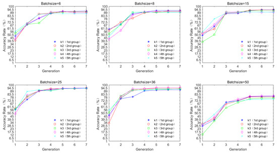 Generation refers to the number of genetic cycles, and accuracy rate represents the average accuracy rate after classification. We found that a high accuracy rate can be maintained under the condition of fewer parameters, and the accuracy rate tends to stabilize after seven generations of cycles. However, the accuracy rate starts to decrease with the growth in batch size, and the accuracy rate tends to be optimal in the genetic cycle when the batch size is chosen to be 25.