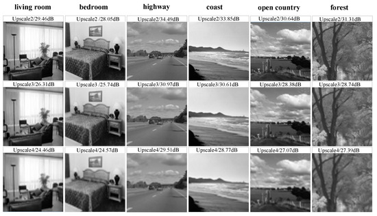 Due to the disadvantage of the limited number of existing low-quality datasets, we reduce the resolution of the 15-scene dataset images, i.e., select different upscale factors to realize the Bicubic interpolation operation. Figure 10 shows the visual effects and PSNR values of outdoor scenes “coast”, “highway”, “open country”, “forest”, and indoor scenes “living room” and “bedroom” under different upscales.