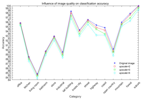 Upon further investigation, it was found that the degradation of outdoor image classification performance after degradation was higher than that of indoor images. For example, when the upscale was changed from 2 to 3, the outdoor image classification performance decreased by 0.43% while the indoor image classification performance decreased by 0.25%. To investigate the impact of low-resolution scene images on classification performance, we recorded the classification results at different resolutions in Figure 11.