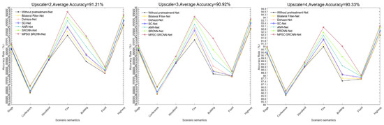 From Figure 12, it is intuitive to find that the introduction of image preprocessing operations improves the classification accuracy of low-quality images. The contribution rate of the reconstruction-based preprocessing method to the improvement of classification network accuracy is generally higher than that of the image enhancement method, especially the method proposed in this paper, which has the best effect. At the same time, it was found that when upscale is set to 3, the classification accuracy of the proposed method can be significantly different from that of other methods, so upscale should be set to 3 in subsequent research.
