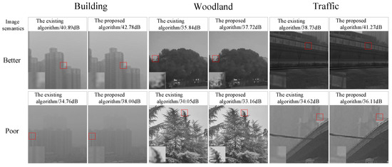 From Table 7, we can see that the semantic classification accuracy of the better scene was improved by 1.53%, and the semantic classification accuracy of the poor scene was improved by 2.11%. It is obvious that the improvement in low-quality images is greater, especially for the “fire” and “building” semantic categories, which were improved by 3.82% and 4.53%, respectively. The advantage of semantic classification for the “stage” semantic category in indoor images is higher than that for the “Conference” semantic category with good lighting. This shows that introducing preprocessing operations is more effective for image classification in scenarios affected by lighting and environment. Therefore, in the next part of the experiment, we will focus on studying the value of the proposed model in classifying low-quality images collected under weather and lighting conditions.