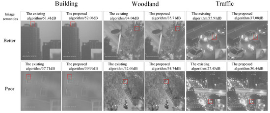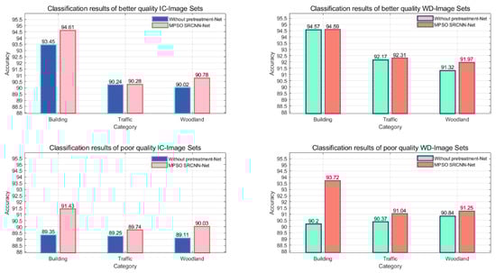 From Table 9, it is found that for better quality images, IC-Image Sets have better classification results with an average improvement of 0.67%. For poor-quality images, WD-Image Sets have better classification performance with an average improvement of 1.42%. In general, the semantic improvement of poor-quality scenes is higher: for the “Building” scene, the classification accuracy of IC-Image Sets and WD-Image Sets is improved by 2.08% and 3.52%, respectively. For the “Traffic” scenario, WD-Image Sets are more suitable, with an improvement of 0.67%. For the “Woodland” scenario, IC-Image Sets are more effective, with an improvement of 0.92%.