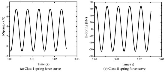 According to the simulation results, the motion-bearing capacity of the class I spring, class II spring, lead screw, and shock absorber spring is analyzed, as shown in Figure 10. The half amplitude of the class I spring force is 4.28 kN, the half amplitude of the class II spring force is 66.67 kN, the lead screw force is 282.66 kN, and the force amplitude of the shock absorber spring is 2.3443 kN. Compared with the sample force, the force of the lead screw is much less than the test force, and the resonant loading has low requirements on the frame. This meets the design requirements.