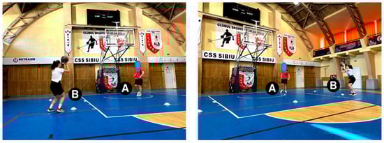 Shot-after-step test. Starting position: The players are placed as shown in Figure 1. Players denoted with “A” are passers, and player “B” is an executor. Test description: Player “B” executes a run to the marker on the opposite side, receives a pass from player “A” on the same side and executes a 2-time stop and a jump shot, after which she executes the same route back. The route is executed 10 times, and the number of marked shots is noted.