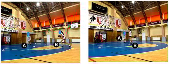 The shot-after-dribbling test. Starting position: the players are placed as shown in Figure 3. Player “A” is the passer, and player “B” is the executor. Description of the test: Player “B” dribbles from the training cone (yellow) from the 3-point line, stops in two steps in front of the second training cone (white), jumps, shoots at the basket and returns to the position from the start cone. Player “A” recovers the ball and passes it back to her. Player “B” executes two consecutive shots from each training cone (5 positions). Ten shots were taken at the basket, and the number of scored shots was noted.