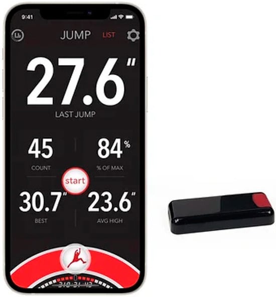 Vert technology [41] consists of a portable sensor dedicated to sports activity, which is designed for the analysis of vertical jumps by measuring the vertical displacement in proportion to the center of body mass of the subject. The device is made up of a belt where the sensor is placed (the belt is attached to the waist of the athlete) and a mobile application for monitoring the data provided via Bluetooth in the mobile application. Vert sensors include an inertial measurement unit (IMU): 3-axis accelerometer, gyroscope and magnetometer. Vert technology allows real-time monitoring of the following vertical jump parameters: number of jumps, landing impacts, flight height, explosiveness, asymmetry of the athlete, % of max (an athlete’s jump consistency and effort), best (the highest jump during the session and average high (the averaged top 25% of all jumps in a session) (Figure 4), [41]. In our study, we used the Vert sensor in the training process and in the testing of the experimental group; in the control group, it was used only when performing motor tests in order to collect data. The Vert sensors used in this study were used during the experimental program and motor tests. The system has the ability to collect data simultaneously from 16 players. The players in the experimental group were constantly monitored when they performed the exercises specific to the experimental program and during the tests. The collected data allowed the training to be monitored in real time, which facilitated the modeling of the training and the quantification of individual and training group results. In this study, an appropriate number of sensors were used in relation to the size of the group of subjects.