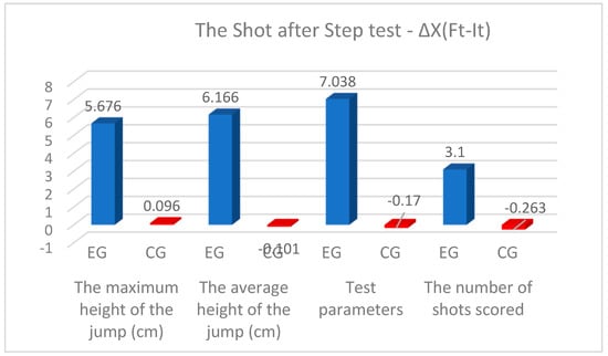In Table 3, Figure 5, it can be seen that the differences between Ft and It for all the parameters of the shot-after-step test for the experimental group were higher than for the control group. For all test parameters for both groups of this study, the differences between the arithmetic means of the final and initial test fell between the upper and lower limits of the 95% CI. The progress recorded between Ft and It was statistically significant for p < 0.05 for all test parameters for the experimental group; for the control group, the differences were statistically insignificant (p > 0.05). Analyzing Cohen’s values, we find that for the experimental group, it fell between 1.86 and 3.62, which reflects a very large effect size. For the control group, the effect size was small, with the values falling between 0.02 and 0.33. It should be noted that the greatest progress among the tests was recorded by the experimental group at a power of 7.038 watts/kg and an average height of the jump of 6.166 cm, and the lowest progress was found in scored shots with 3.100 throws. In the control group, the progress between the tests was recorded only in the maximum height of the jump by 0.096 cm (Table 2). It should be noted that the greatest progress recorded for scored shots was found in the experimental group after 3.100 throws as a result of practicing in the experimental program, while the control group result was 0.263 throws.