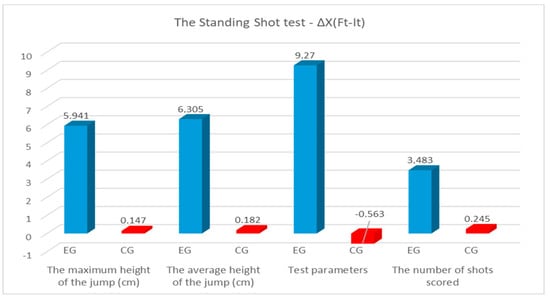 According to Table 6, Figure 6, in the standing shot test, we identified progress in all parameters between the initial and final testing in both groups, but those of the experimental group were higher than those of the control group. The progress recorded between Ft and It was statistically significant for p < 0.05, for all test parameters, only in the experimental group. For all test parameters for both groups of this study, the differences between the arithmetic means of the final and initial test fell between the upper and lower limits of the 95% CI; the results show that they can be considered reliable for this study. Analyzing Cohen’s values, we find that for the experimental group, it fell between 1.98 and 4.27, which reflects a very large effect size and emphasizes that the practiced experimental program was effectively reflected by the great progress made between initial and final tests. For the control group, the effect size was small, with the values falling between 0.04 and 0.55. It should be noted that the greatest progress among the tests was registered by the experimental group with a power of 9.270 watts/kg and at the average height of a jump of 6.305 cm, and the lowest progress was in scored shots with 3.483 throws. In the control group, progress between the tests showed that large progress was recorded in scored shots of 0.245 and with the average height of the jump of 0.182 cm, and in strength, the difference was negative (Table 6). The progress of the experimental group was much higher than the control group in all parameters of the standing shot test, which demonstrates the positive impact of the training program implemented through the use of Vert technology. This aspect is especially noticeable in scored shots, where the experimental group progressed with 3.483 shots, while the control group progressed with only 0.245 throws.