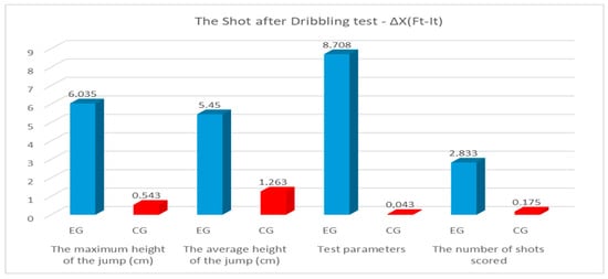 According to Table 8, Figure 7, we find that in the shot-after-dribbling test of the experimental group, Cohen’s values fell between 1.66 and 5.88, which reflects a very large effect size. For the control group, the effect size was small, with the values falling between 0.02 for strength and 0.40 for average height. The differences between Ft and It for all parameters of the shot-after-dribbling test for the experimental group were higher than for the control group. For all test parameters for both groups of this study, the differences between the arithmetic means of the final and initial test fell between the upper and lower limits of the 95% CI. The progress recorded between the final and initial testing was statistically significant for p < 0.05 for all analyzed parameters in the experimental group, and for the control group, it was only statistically significant for the average jump height. The greatest progress among the tests was recorded by the experimental group at a strength of 8.708 watts/kg and a maximum height of the jump of 6.035 cm, and in the control group, the greatest progress among the tests was recorded at an average height of the jump of 1.263 cm and a maximum height of the jump of 0.543 cm. Analyzing the scored shots, we notice that the experimental group progressed as a result of the implemented experimental program with 2.833 shots, while the control group had only 0.175 shots.