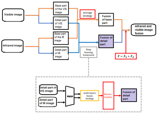 Employing the advancements of deep learning as a powerful tool in various image-processing applications, we applied a deep-learning-based image fusion method [33] in this study to seamlessly integrate features from IR and visible imagery. As Figure 2 indicates, this method encompasses a series of steps, starting with the decomposition of the source images into base components and detailed content [34]. Subsequently, the fusion process begins with the integration of base parts utilizing a weighted-averaging strategy. Simultaneously, the detailed content undergoes fusion through a multi-layer approach facilitated by a deep learning network [30]. The culmination of these steps results in the reconstruction of a fused image that provides a comprehensive representation, amalgamating information from both modalities.