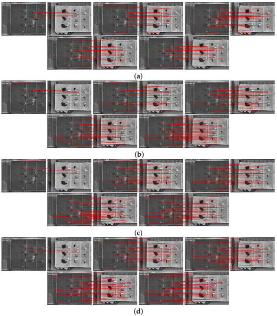 Feature matching results using proposed method with the trade-off between NMS and feature-points threshold parameters: (a) NMS:5, key-points threshold of each image set from left to right: 0.05, 0.005, 0.0005, 0.00005, 0.00000. (b) NMS:6, key-points threshold of each image set from left to right: 0.05, 0.005, 0.0005, 0.00005, 0.00000. (c) NMS:7, key-points threshold of each image set from left to right: 0.05, 0.005, 0.0005, 0.00005, 0.00000. (d) NMS:8, key-points threshold of each image set from left to right: 0.05, 0.005, 0.0005, 0.00005, 0.00000.