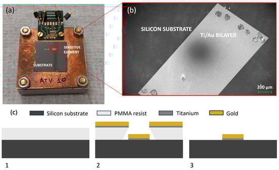 Monocrystalline silicon substrates were cleaned with acetone and isopropanol. Electron beam lithography (Raith VOYAGER lithography system) on PMMA e-resist was used to define the two square geometries: the (1 × 2) mm2 rectangular structure (Figure 1a, right pattern) and the “strip” geometry, consisting of a (1 × 0.1) mm2 strip with two (0.6 × 0.6) mm2 lateral pads for wired connections, with a total footprint equal to (0.6 × 2.2) mm2 (Figure 1a, left pattern). The Ti/Au bilayer is then deposited by electron beam evaporation in high vacuum conditions without substrate heating. A Balzers e-beam evaporation system is used, with a base pressure under mbar, ensuring the deposition of both Ti and Au films without exposing the Ti film to air. The two films are deposited in rapid succession, taking a time interval of 2 min to switch the evaporation procedure for the two samples. To increase the protection of the samples’ purity from gaseous contaminants (such as oxygen molecules) during the deposition, a 70 nm thick titanium layer is evaporated before the actual Ti/Au deposition on the substrates [21]. The Ti and Au films were deposited at a rate of 1.5 Å/s and 0.5 Å/s, respectively. The starting pressure for Ti deposition was mbar. The thickness of the Ti/Au layers was controlled through a high-precision quartz micro-balance (QMC). As the last step, a lift-off procedure was performed using acetone in an ultrasound bath to achieve the desired patterns. Both patterns come from the same deposited Ti/Au stack, with thicknesses equal to 90 nm and 60 nm, respectively.