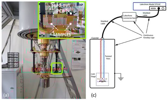 The samples were electrically characterized by measuring the resistance–temperature trend. First, a cryostat (3He/4He dilution cryostat by Oxford Instruments, see Figure 2a) was used to cool down the samples, reaching a base temperature of 10 mK. The entire cooling process took about 24 h. Inside the cryostat, the samples were enclosed between two copper sheets to avoid radioactive loads and fixed with rubber cement glue to allow for good thermalization (see Figure 2b) [22]. A dedicated printed circuit board (PCB) was fixed between the two sheets, allowing read out of the resistance using the 4-wire method, with the help of a resistance bridge (LakeShore, Model 370 AC) in current excitation mode. The excitation current has been kept low ( = 1 A) to ensure that the dissipated power is in the range of a few pW, thus preventing the measurements from being affected by sample self-heating effects due to the Joule effect. In Figure 2c, the complete measurement setup is shown: the different components (i.e., the cables, the connector box, and the cryostat) constitute a continuous Faraday cage to minimize EMI towards the samples inside the cryostat.