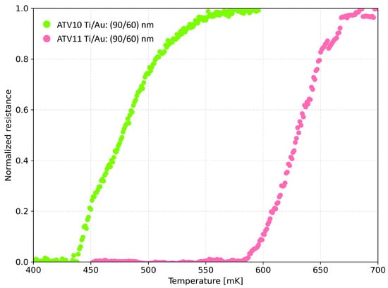 Resistance–temperature curves of the two-square geometry ATV10 (green left curve) and ATV11 (pink right curve) samples. The resistance is normalized with respect to the normal resistance values: for ATV10, is equal to 0.23 ; for ATV11, is equal to 0.54 .