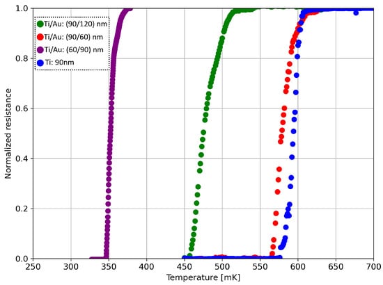 Normalized resistance–temperature curves for Ti/Au 90 nm/120 nm thick bilayer (green dots, Au/Ti ratio equal to 1.33, = 0.11 ); Ti/Au 90 nm/60 nm thick bilayer (red dots, Au/Ti ratio equal to 0.57, = 0.63 ); Ti/Au 60 nm/90 nm thick bilayer (purple dots, Au/Ti ratio equal to 1.5, = 0.17 ); and Ti 90 nm thick monolayer (blue dots, = 9.34 ).