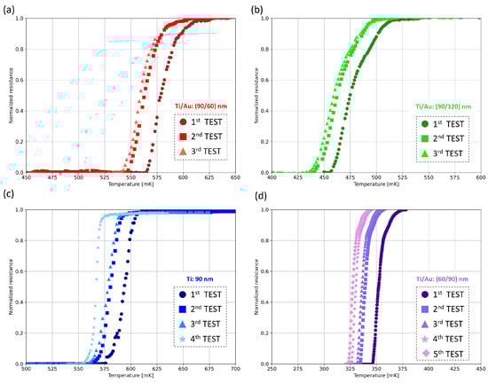 The Ti/Au 90 nm/120 nm thick bilayer (green curve in Figure 4) presents a significant critical temperature reduction with respect to the Ti/Au 90 nm/60 nm thick bilayer (red in Figure 4). This behavior is consistent with the proximity effect theory, according to which an increase in the normal metal (Au) thickness leads to a strengthening of the proximity effect, i.e., a larger reduction in the titanium critical temperature [23]. Decreasing the titanium thickness from 90 nm (red curve in Figure 4) to 60 nm (purple curve in Figure 4), thus increasing the Au/Ti thickness ratio from 0.67 (red curve in Figure 4) to 1.5 (purple curve in Figure 4), leads to an even more pronounced shift in the critical temperature toward lower values.
