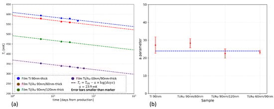 The experimentally-obtained values, extracted from the tests described in Section 4.1, were fitted with Equation (1). The fitting procedure was performed independently for the different samples, recovering both the a parameter and the values. The best fits are reported in Figure 6a (dashed lines). The a value is determined by averaging the results obtained using the fitting procedure on the data acquired for the different samples. The results of the fitting procedure for the a parameter are reported in Figure 6b, showing that there is not a statistically meaningful difference in the aging trend over time for the various bilayers, regardless of the Ti/Au layers’ thicknesses. The resulting average value of the parameter is a = (23.9 ± 0.9) mK. As we can see in Figure 6a, the experimental data show very good agreement with the theoretical behavior.