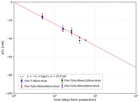The experimental data acquired on the fabricated samples are in agreement with the model proposed in [15] for describing the aging behavior of the Ti monolayer and Ti/Au bilayers for TES applications. The model expression that predicts the critical transition temperature as a function of time is [15]:
