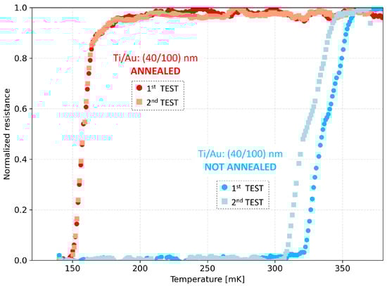 Normalized resistance–temperature curves measured for non-annealed (blue and light blue, = 0.15 ) and annealed (red and orange, = 0.15 ) Ti/Au 40 nm/100 nm thick bilayers. The second test is performed 7 days after the first test (sample stored in air for 3 days and in vacuum for 4 days).