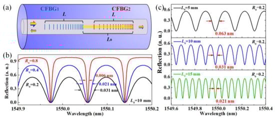 The proposed FPI sensor that was constructed using a pair of CFBGs is sketched in Figure 1a, where the two CFBGs are identical (i.e., similar reflection ratio and bandwidth). The grating pitch of the CFBG gradually increases or decreases along the fiber axis (z direction), resulting in a gradual change in the reflection wavelength. The phase-matching condition of the CFBG can be deduced from a uniform FBG [18] to: , where and denote the resonant wavelength and the effective index of the fundamental core mode, respectively, and represents the grating pitch of the CFBG. For linear chirped CFBG, the grating pitch varies linearly along the fiber axis according to ; where represents the grating pitch at the starting position and represents the chirp rate. When two identical CFBGs are inscribed in the fiber core one by one, the reflected light from the two CFBGs will result in an interference pattern in the frequency domain according to the white-light interference principles. Assuming the two CFBGs have the same reflection rate of R0, and the distance between the edges of the two CFBGs is L0. The reflection spectrum of the CFBG-based FPI can be expressed as [19]: