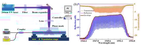 A chirped phase mask with a pitch of 1070 nm and a chirp rate of 10 nm/cm is employed for CFBG inscription. A 266 nm, pulse UV laser with pulse width and repetition ratio of 1.5 nm and 10 kHz is employed for inscription. The resulting center wavelength of CFBG is ~1550 nm, according to the grating equation , and the reflection bandwidth of the CFBG is proportional to scanning length L. The scanning setup for CFBG fabrication is sketched in Figure 2a, which is similar to [20]. A CFBG (CFBG1) is first inscribed in a hydrogen-load single-mode fiber (SMF-28). The scanning length (i.e., CFBG1 length (L)) is precisely controlled at ~5.4 mm, resulting in a reflection bandwidth of ~7.8 nm. Then, the fiber is moved axially (z direction) for a distance (L0 = 6.9 mm) and the same inscription process is repeated, with the same CFBG (CFBG2) inscribed. In this process, the variation in the grating pitches for the two CFBGs are in the same direction, resulting in a similar cavity length L0 for each reflection wavelength (as sketched in Figure 1a). Light launched into the fiber will be reflected by the two CFBGs and the reflected light will interfere with the frequency domain (blue line within Figure 2b). Inferring from the transmission spectrum (orange line within Figure 2b), the reflection of the two CFBGs is ~30%. The FSR of the interference spectrum is identified as ~0.12 nm, which agrees well with the designed cavity length (L0) of ~6.9 mm. The FWHM of the CFBG-based FPI (FPI1) is identified as ~0.036 nm, corresponding to a Q factor of ~4.3 × 104. The sensor is finally annealed in a 120 °C oven for 12 h to get a stable spectrum.