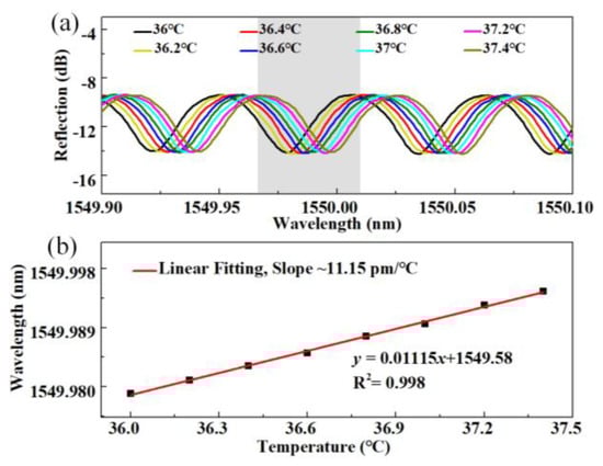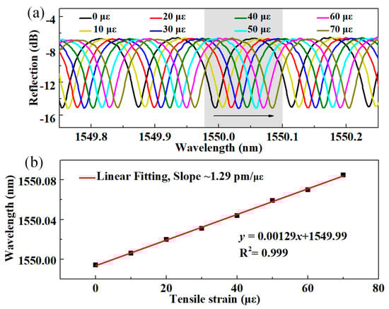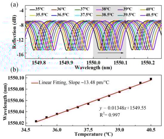 Proof-of-concept temperature tests are then carried out, where a high-precision (0.1 °C) digital temperature oven that is similar to [21] is employed and an ultrahigh-resolution (0.005 nm) optical spectrum analyzer (OSA: Yokogawa, AQ6380, Tokyo, Japan) and a supercontinuum source (YSL-SC-5) are employed for online monitoring of the temperature-induced wavelength drift. FPI1 is placed in the center of the oven and the temperature is increased from 35 to 40.5 °C in steps of 0.5 °C. Figure 3a shows the variation in a resonant dip located at ~1550 nm grey-shaded area) versus the temperature. Between each temperature step (0.5 °C), ~0.007 nm wavelength drift can be clearly identified. Figure 3b shows the experimental and linear fit results, where the temperature sensitivity is ~13.48 pm/°C, with R2 of 0.997. It is worth noting that the proposed sensor is sensitive to both temperature and strain, as such, the setup for temperature tests must be carefully designed to maintain the accuracy and reliability of the tests. We place the sensor in a temperature oven with two sides opened for the sensor pigtails. The pigtails of the sensor are naturally released to reduce the strain effects.