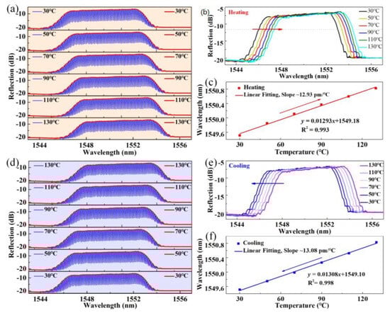 The lengthening of the cavity can improve the spectrum Q factor and thus the temperature resolution while the FSR of the spectrum is reduced accordingly, restricting the temperature dynamic range. According to the aforementioned solution, the envelope of the interference spectrum may be tracked for large dynamic range measurements. To verify this approach, temperature tests within a larger dynamic range are then carried out. The temperature is increased from 30 °C to 130 °C in steps of 20 °C, and the reflection spectrum evolution is recorded and plotted in Figure 4a. The envelope of the reflection spectrum can be routinely extracted as shown in Figure 4b. As long as the envelope is extracted, the center wavelength of the envelope peak can be easily extracted. By tracking the center wavelength of the envelope versus temperature change, temperature information can be obtained and calibrated. Figure 4c shows the tracked center wavelength of the envelope versus the temperature, where a sensitivity of 12.93 pm/°C is obtained by a linear fit (R2 = 0.993). The cooling process is also monitored and the result is shown in Figure 4d–f. A temperature sensitivity of ~13.08 pm/°C (R2 = 0.998) is obtained. The little deviation in temperature response between the heating and cooling processes may be attributed to thermal stress release as well as experimental errors.