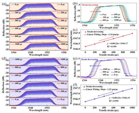 For larger dynamic range strain sensing, the dual-mode spectrum interrogation approach can be employed. Figure 6a,d illustrates the recorded reflection spectrum evolutions with strain increasing (0–1000 µε) and decreasing (1000 µε to 0 µε) in a step of 20 µε. The envelopes of the reflection spectra are extracted and shown in Figure 6b,e. The center wavelength of the envelope varies with the applied strain, where a sensitivity of ~1.24 pm/με is obtained by a linear fit of the data (R2 = 0.999). The sensitivity is comparable to the results obtained by tracking one of the resonant dips within the interference spectrum.