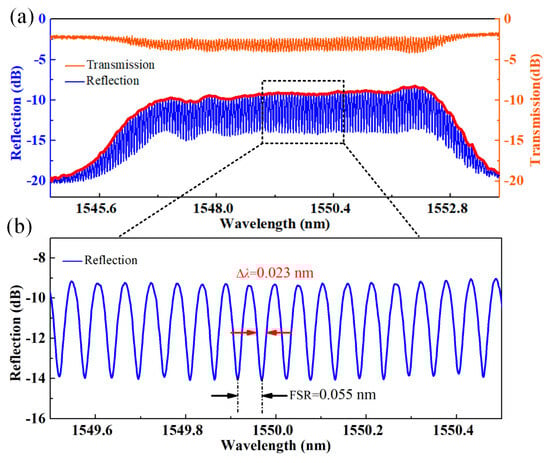 (a) Reflection (blue line) and transmission (orange line) spectra of the FPI2 with a cavity length of ~15.1 mm, the red lines represent the envelop of the spectrum; (b) Enlarged view of the reflection spectrum, where the bandwidth and FSR are ~0.023 and ~0.055 nm, respectively.