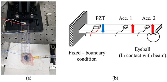 In this study, to actually measure IOP, we adopted a method of placing a beam on the eyeball and then applying vibration. The contact stiffness that occurs at this time has a relatively low value compared to the beam or eye, so even if a difference occurs, it may be difficult to observe. Therefore, apart from the eyeball, which cannot arbitrarily adjust the stiffness, a plastic material with a low Young’s modulus was selected to lower the bending stiffness of the beam. Since the bending stiffness is also proportional to the cube of the thickness of the beam, a ruler was used to easily select the thinnest object possible. The method applied in this paper was designed to attach a plastic ruler to the pupil to aim for measurement in the frontal direction. Since a rebound tonometer is used to measure IOP, it is necessary to secure space in the pupil area. For this purpose, a small hole was drilled in the plastic ruler and the experimental settings were adjusted so that this part was located above the pupil, which can be seen in Figure 1. In order to apply vibration by changing the excitation force, a piezoelectric element actuator (PZT) was attached near the fixed end of the beam using epoxy resin. The PZT used was a PL055.3x (PICMA, Karsruhe, Germany), with an axial resonant frequency of >600 kHz and an operating voltage range of −20 to 100 V. To measure the vibration response and derive the transfer function, two accelerometers (Acc) were installed at different positions using mounting wax. The accelerometers were model 352A21/NC (PCB Piezotronics, Inc., Depew, NY, USA), featuring a sensitivity of 10.30 mV/g, a frequency range of 1.0 to 10,000 HZ, and a measurement range of ±500 g.