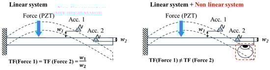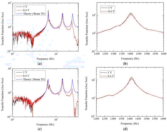 To conduct experiments by varying the excitation force, the signal input to the PZT was set as follows. The magnitude of the voltage was set at two intensities, 0.4 V and 1 V, to obtain different excitation forces. A random signal capable of exciting a frequency band from 0 to 3600 Hz was applied for 30 s, which was designed to sufficiently converge when measuring the transfer function. Applied vibration is briefly described in Table 1. The transfer function of the acc to ACC was calculated using an ACC near the fixed end as a reference.