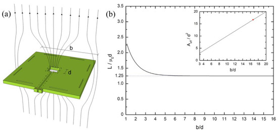 The dc SQUID magnetometer design simply consists of a large washer-shaped loop interrupted by two Josephson junctions. In other words, the dc SQUID ring consists of a single coil made of a superconducting square structure including a hole that has a small side length d with respect to the outer dimensions b (Figure 1a). In such a way, due to Meissner’s effect, the magnetic flux lines are focused inside the central hole (focusing effect), as reported schematically in Figure 1a. This implies that the screening currents essentially flow along the hole edges making the dc SQUID inductance insensitive from the outer dimension. Indeed, if the coil width w of the washer is greater than the hole size d, the inductance can be calculated only by considering the hole dimension. In particular, as shown in Figure 1b, the washer inductances can be calculated as L ≅ 1.25 µ0d (µ0 is the vacuum magnetic permeability) already starting from b > 3d, i.e., as soon as the coil width exceeds the hole dimension [28,29,30,31]. Theoretically, one can realize a dc SQUID washer wide enough to obtain a suitable effective area to increase the magnetic field sensitivity. Unfortunately, to insert the Josephson junctions, a slit that completely cuts one side of the washer needs to be inserted with the consequent dispersion of the magnetic field threading the superconducting loop. So, the screening current path becomes like the one shown in Figure 1a, giving rise to an additional inductance, which increases with the slit length ℓ, and reducing the possibility to extend the outer washer dimension at will. Hence, the total inductance can be written as follows [31]: